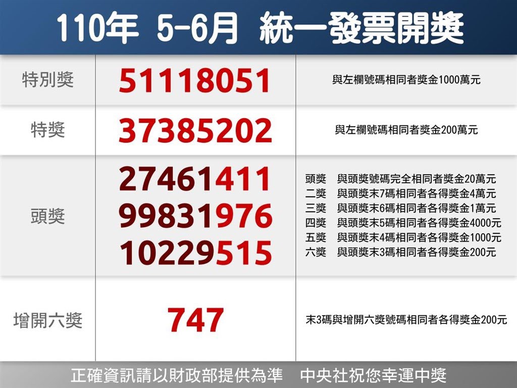 - 110年5、6月期統一發票千萬元特別獎獎號今天公布,特別獎號碼為51118051;200萬元特獎號碼為37385202。