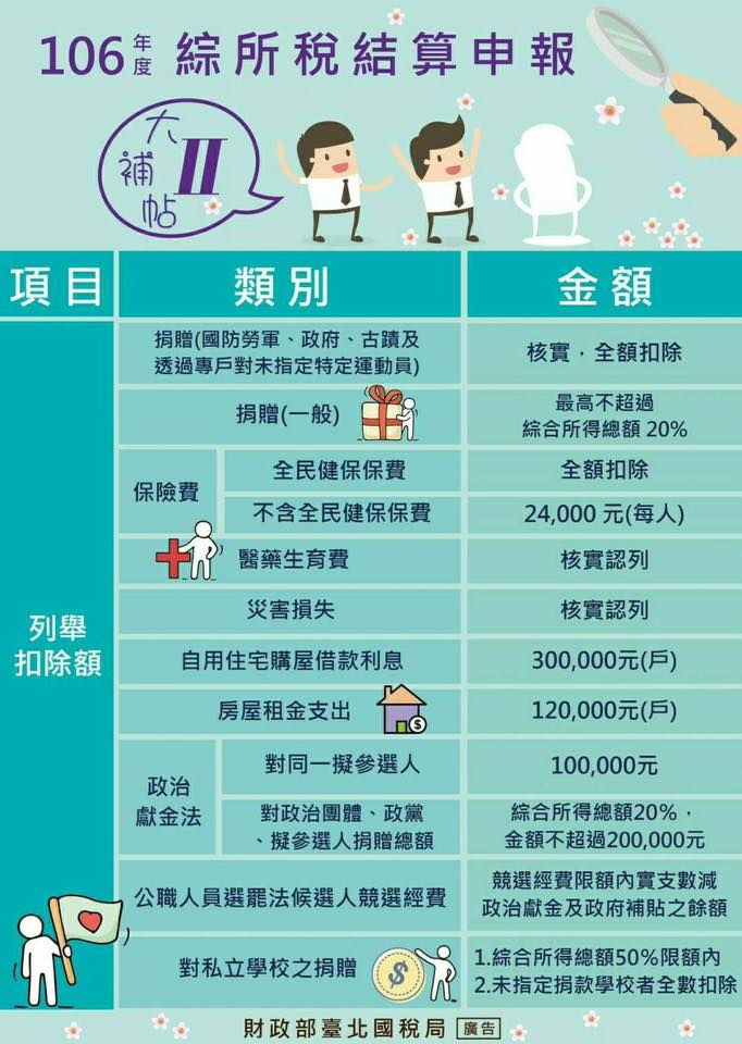 今年(106年度)的綜合所得稅各項扣除額簡列如下: