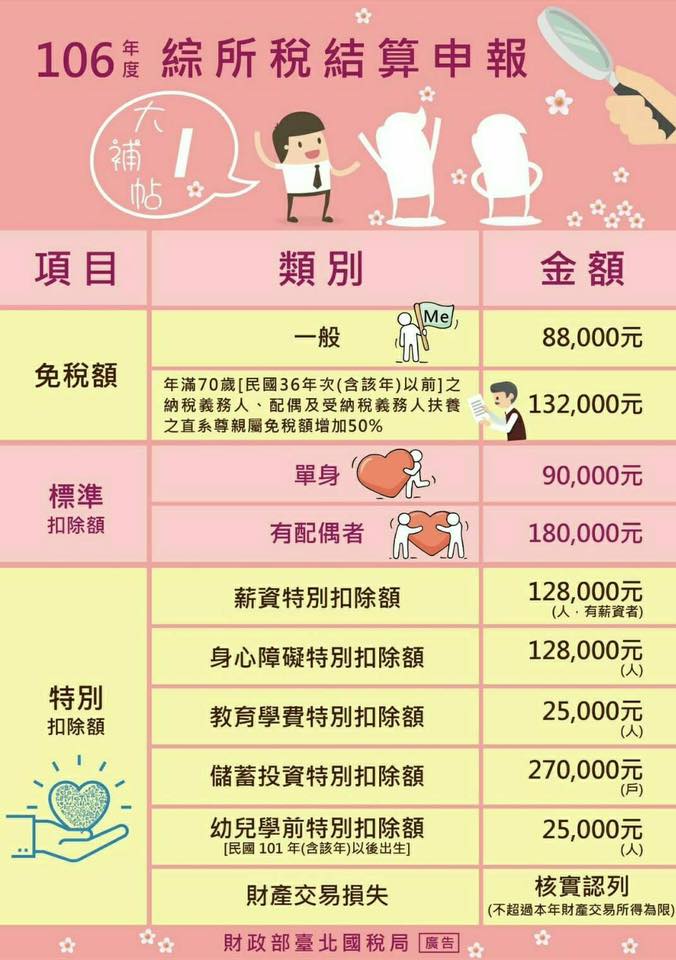 一、免稅額:每人88,000元;年滿70歲之納稅義務人本人、配偶及受納稅義務人扶養之直系尊親屬,其免稅額為132,000元。(2018報稅小確幸:2017報稅年度的免稅額為85,000元與127,500元,2018報稅年度的免稅額提高了。)